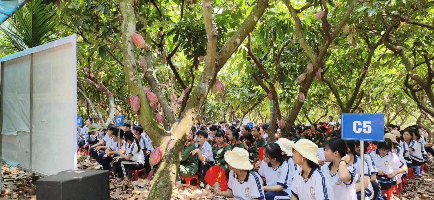 Thực hiện kế hoạch năm học và chương trình giáo dục của nhà trường, chuyến đi được tổ chức nhằm tạo ra một sân chơi bổ ích, giúp học sinh gắn kết những kiến thức đã học trên lớp với thực tiễn sinh động của cuộc sống. Dưới sự hướng dẫn tận tình của các cô chú trong HTX, các em được tìm hiểu chi tiết về đặc tính sinh học, quy trình trồng và cách chăm sóc cây cacao.