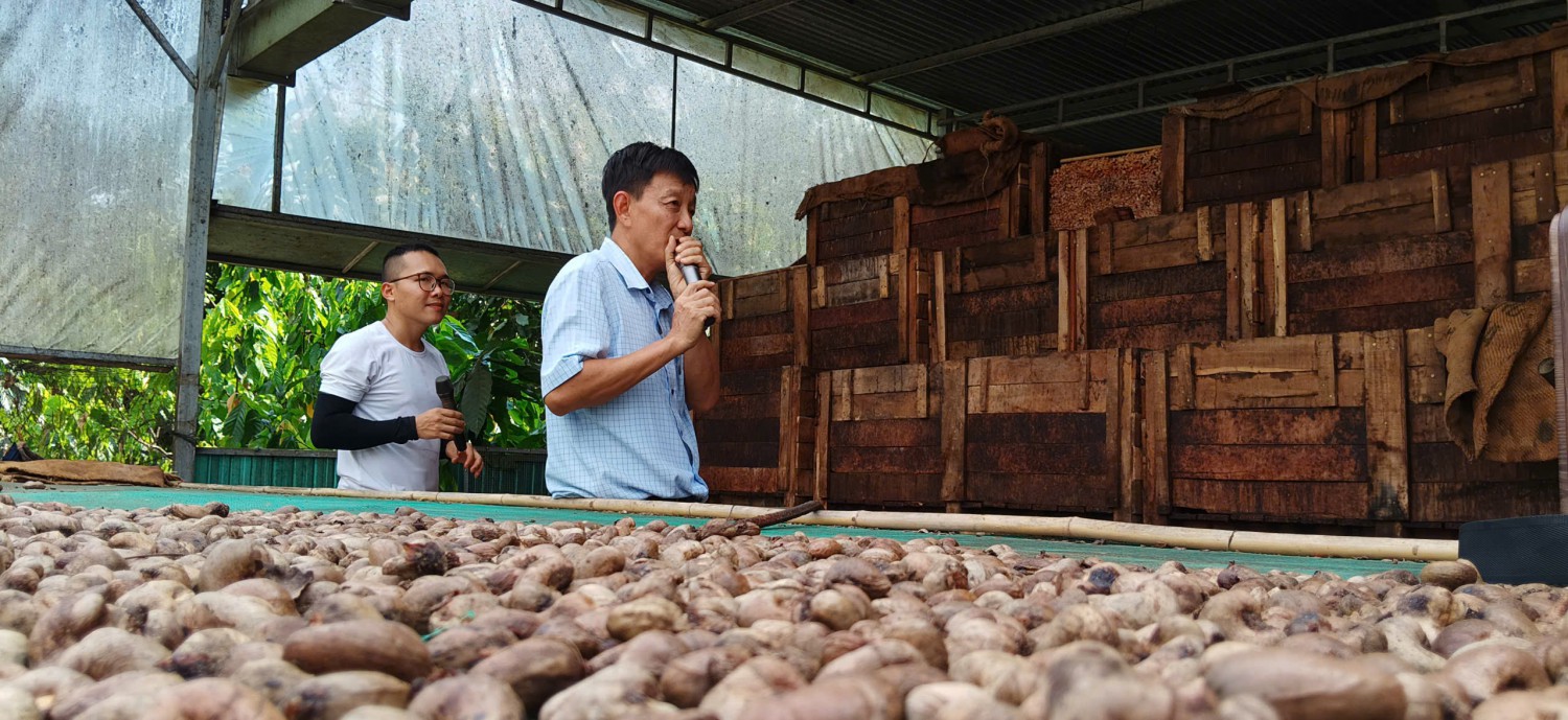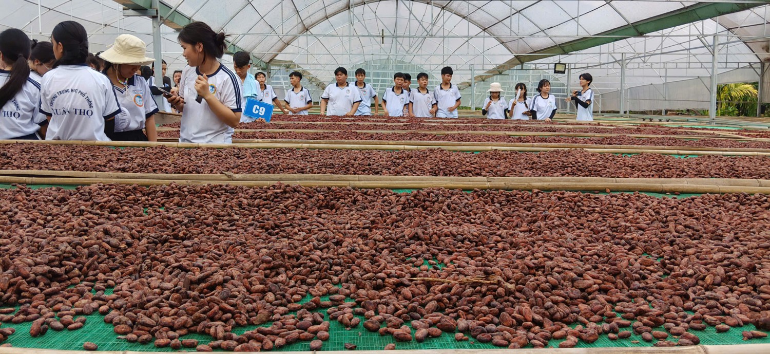 Niềm vui hiện rõ trên ánh mắt khi các em được tận tay chạm vào, di chuyển đến khu vực phơi, sấy và chế biến. Tại đây, các bạn học sinh đã tận mắt chứng kiến công đoạn sơ chế, lên men hạt cacao – những bước quan trọng để làm ra các sản phẩm chocolate và bột cacao thơm ngon. Song song với việc tham quan, các nhóm học sinh cũng đã làm việc cực kỳ nghiêm túc để hoàn thành các phiếu học tập trải nghiệm thực tế theo yêu cầu của giáo viên.