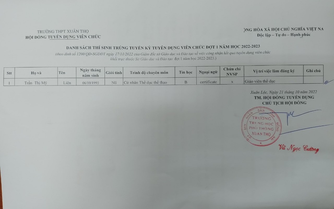 Danh sách thì sinh trúng tuyển tuyển dụng viên chức đợt 1 năm học 2022-2023